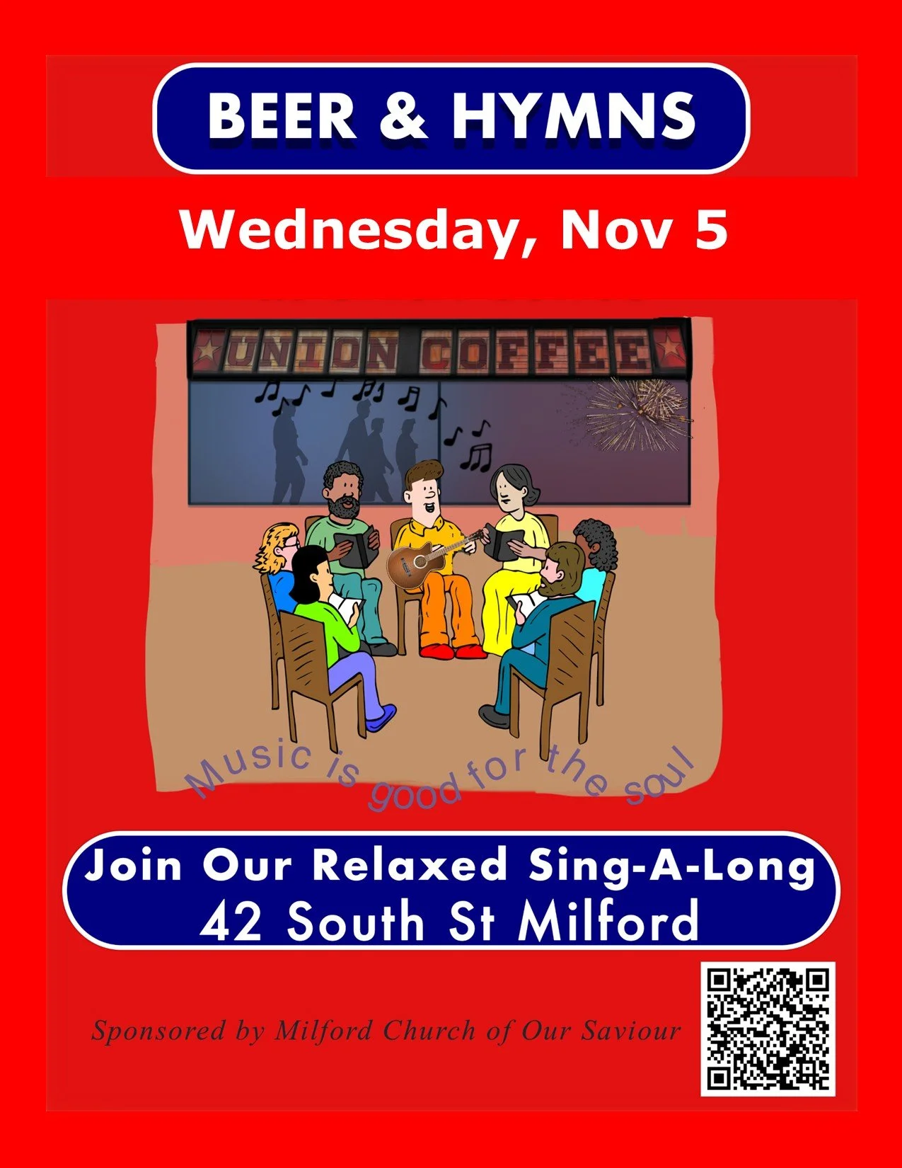 We host a monthly Beer and Hymns usually on the first Wednesday of the month. In November, it will be held on Wednesday Nov 5 from 6-8 p.m. at the Union Coffee Co., 42 South St., Milford. A variety of beverages will be served, nonalcoholic, beer and wine. The idea is to get together at a location which is not typically associated with a place of worship, with songs to sing and music accompaniment. We provide binders with a variety of music. Father Michael has his guitar, and sometimes there are other handheld instruments as well. Bring your voice, bring an instrument if you have one, and if you have a favorite hymn, we will try to sing it or at least practice it for next time. If you have any questions please email the church office HERE.